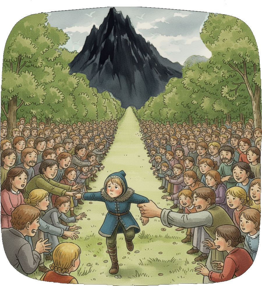 Der ehemalige Bergpfad war inzwischen zu einer breiten Allee geworden. Rechts und links wuchsen prächtige Bäume. Galu konnte ganz am Ende der Allee das Schloss sehen. Es kann ja nicht mehr weit sein, dachte er und begann zu rennen. Doch merkwürdig – je länger er rannte, desto kleiner wurde das mächtige Gebäude vor ihm. Ich bin zu langsam, dachte Galu. Ich muss schneller werden. Doch es half nichts. Das Schloss kam nicht näher. Statt dessen nahm er wahr, wie sich während er lief Menschen um ihn scharten und ihn mit verdutzten Augen ansahen. „Lasst mich, ich muss weiter!“ rief er, doch es kamen immer mehr und starrten ihn an. Sie stellten sich ihm in den Weg, sie zogen an seinen Armen und bremsten ihn, wo sie ihn erwischen konnten. „Lasst mich!“ rief er ein zweites Mal, und das Schloss war schon kaum noch zu sehen. „Ich bin hier falsch, dachte Galu. Ich bin hier falsch. Irgendwann verschwanden die Menschen wieder und ließen Galu laufen, doch er war inzwischen zu erschöpft, die Füße sanken ihm weg, Galu ließ sich am Fuße eines Baumes nieder und fiel sofort in den tiefsten Glauschlaf, den je ein Fabelwesen erlebt hatte. Es dauerte nicht lange, bis sich ein süßer Traum seinen Weg durch den ermatteten Kopf bahnte.