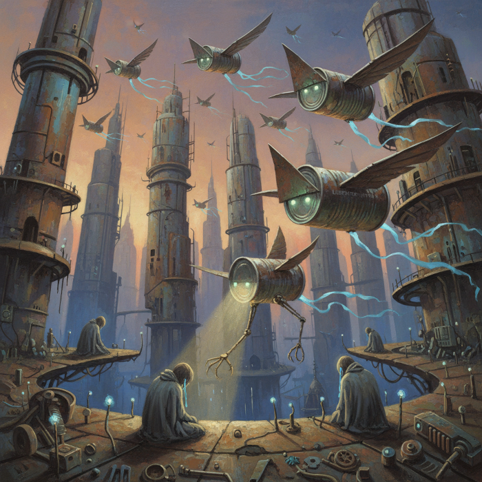 Ein Mann öffnet, lässt sich vom fliegenden Blech-Roboter etwas aushändigen. Dann schwebt es zurück an mir vorbei. Ich geselle mich zu ihm, begleite es ein paar Meter. Da ich bemerke, dass es sprechen kann, frage ich nach woher und wohin. Es erklärt mir, dass es zurück müsse, und ich nicht mitgehen solle.